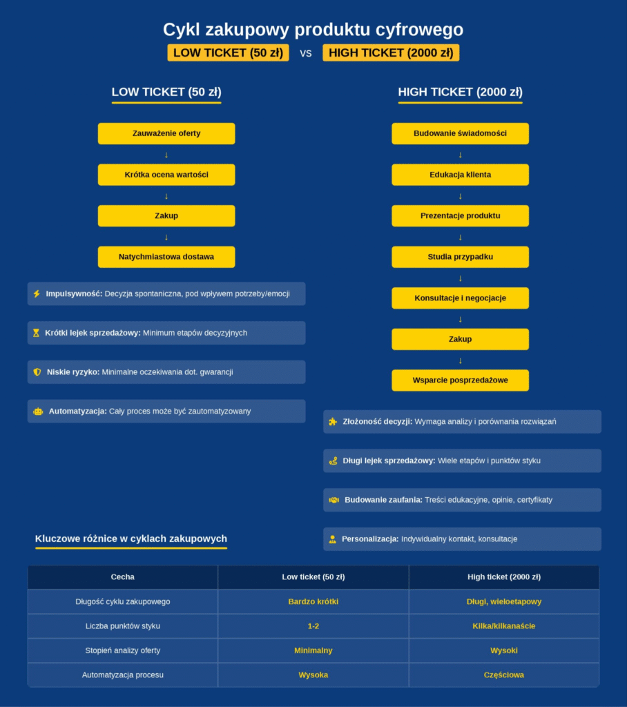 Produkty cyfrowe mają specyficzny cykl zakupowy – klient potrzebuje średnio 7–14 dni od pierwszego kontaktu do decyzji zakupowej. Meta optymalizuje kampanie pod szybkie konwersje, premiując produkty impulsowe. Twój kurs za 997 PLN przegrywa w aukcji z produktem za 49 PLN, który konwertuje tego samego dnia.