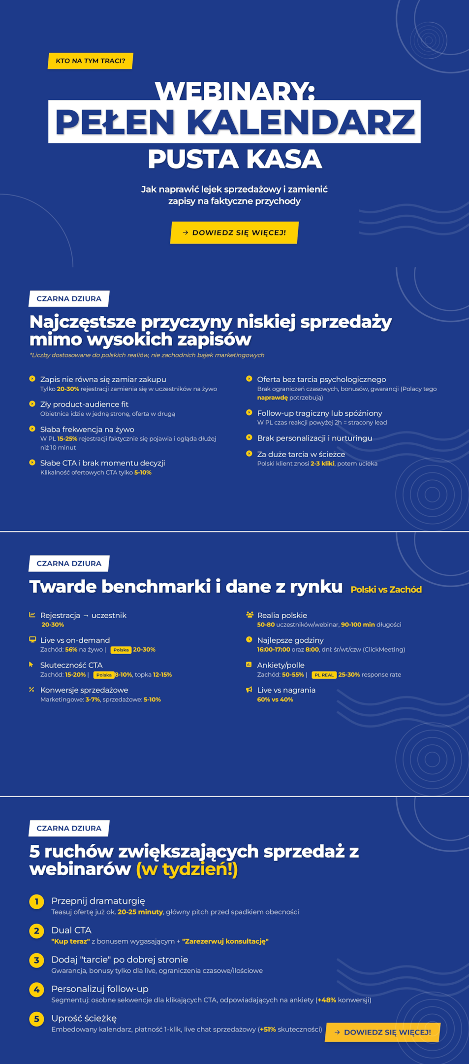 CTR oferty na webinarze: 15-20% to średnia, 25-30% to top. Masz poniżej 10%? Twoje CTA jest za słabe, niewidoczne lub źle umiejscowione. Pokaż CTA przed 70. minutą webinaru, powtórz 3-4 razy, dodaj natychmiastowy dostęp do bonusów dla klikających.