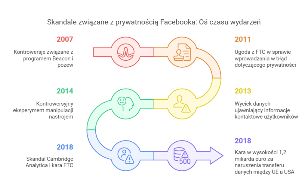 - Program Beacon (2007) – Facebook śledził aktywność użytkowników na stronach trzecich i udostępniał te informacje bez wyraźnej zgody. Doprowadziło to do pozwu zbiorowego i kary w wysokości 9,5 miliona dolarów [[Wired]].