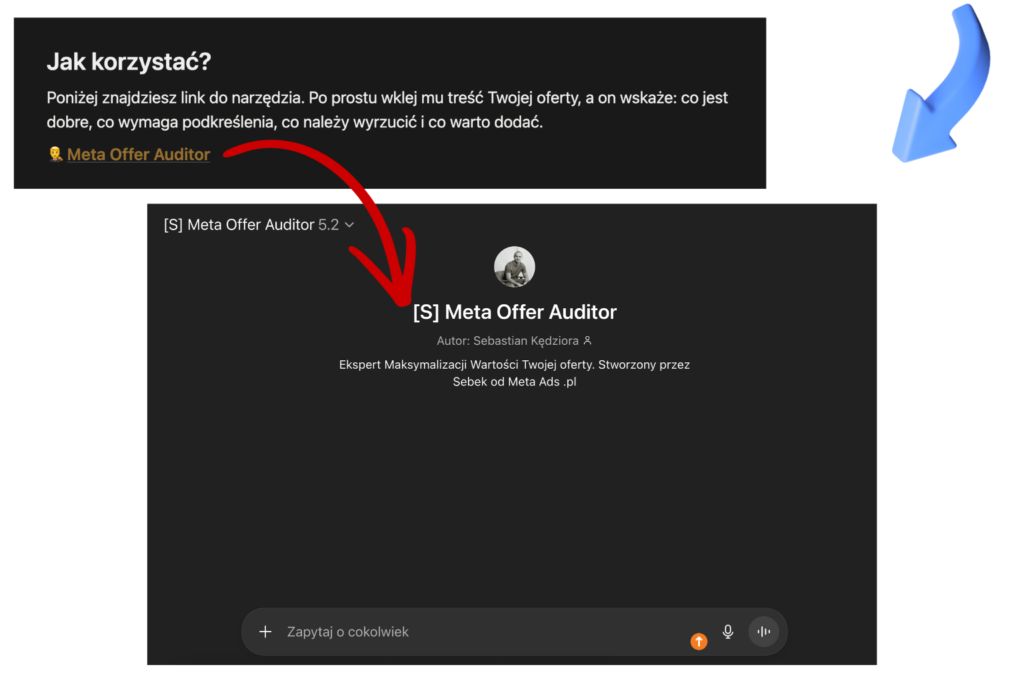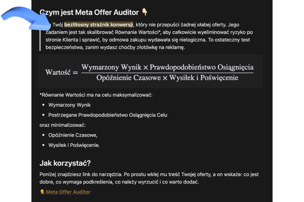 Wystarczy, że wkleisz treść swojej strony sprzedażowej, a ten wyspecjalizowany GPTs wskaże Ci konkretne luki w Równaniu Wartości i gotowe rozwiązania. Otrzymasz precyzyjne rekomendacje, co dodać, a co usunąć, by Twoja oferta stała się logicznym wyborem ‘nie do odrzucenia’ dla każdego klienta.