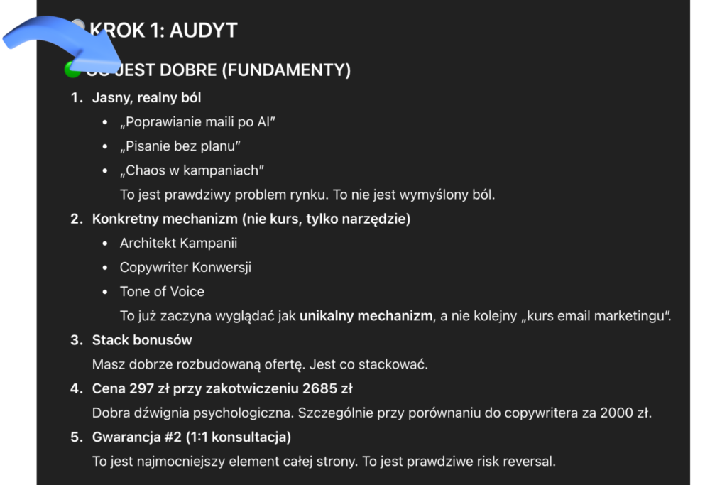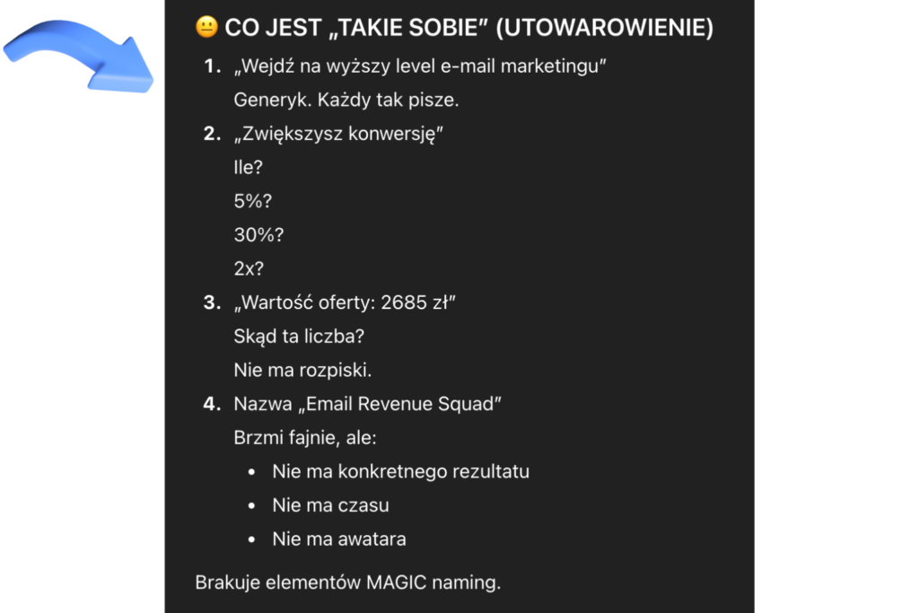 Wytknie Ci każdy element oferty, który brzmi jak ‘kolejny produkt dla wszystkich’ i obniża Twoją marżę. Zamiast walczyć ceną, dostaniesz wskazówki, jak zamienić nudne cechy w unikalną wartość, której konkurencja nie skopiuje.
