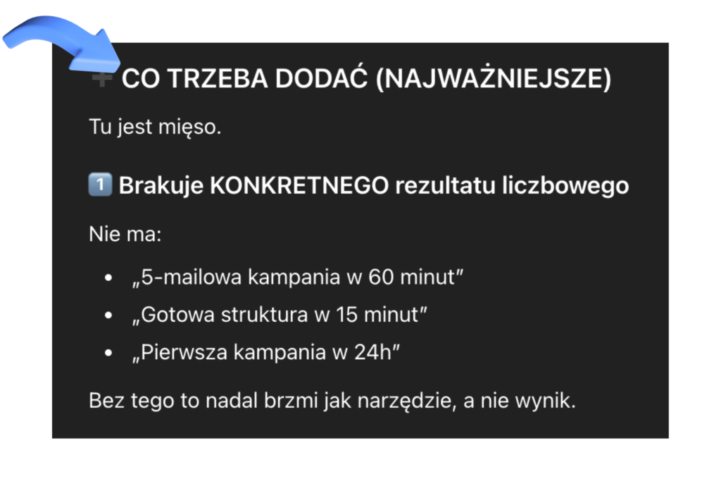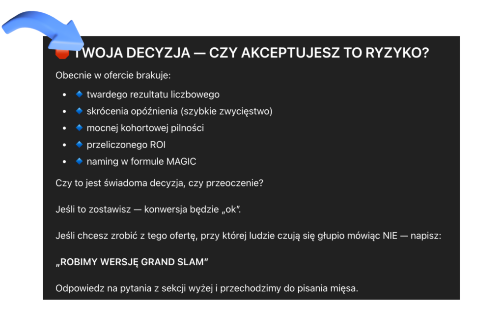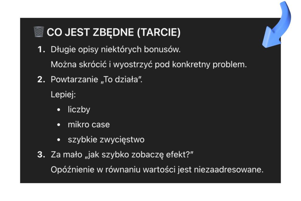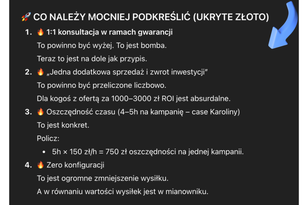 Zrozumiesz, które elementy Twojej oferty marnują swój potencjał i wymagają mocniejszego akcentu. Otrzymasz jasne instrukcje, jak zamienić ‘ukryte złoto’ w hipnotyczne korzyści, które zwiększą postrzegane prawdopodobieństwo sukcesu.