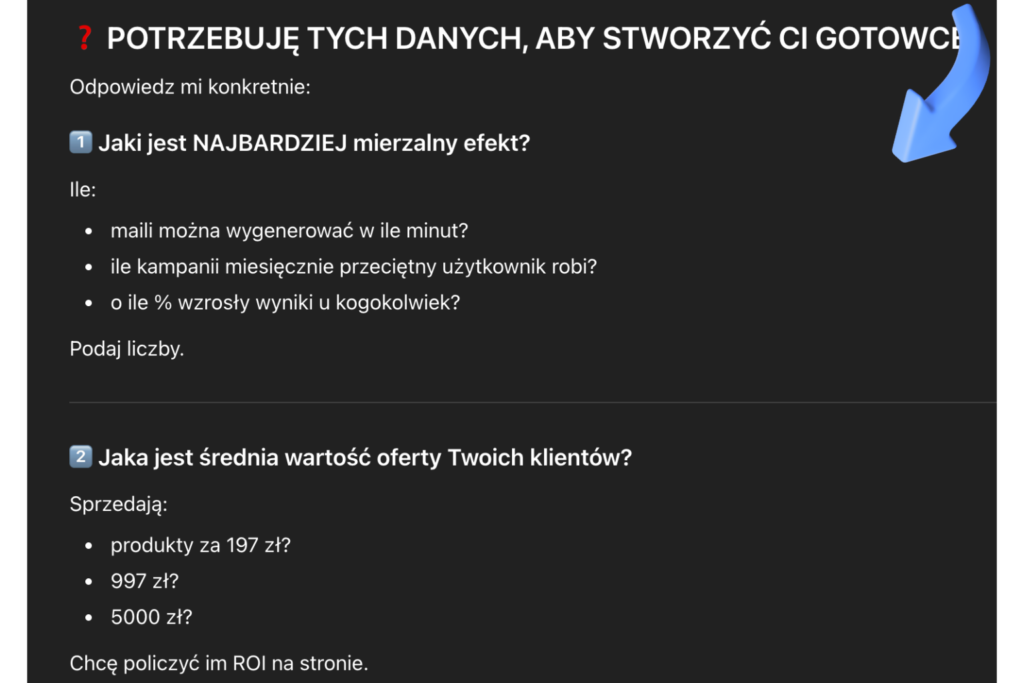 Precyzyjne pytania pogłębiające pomogą nakarmić Równanie Wartości twardymi danymi. Otrzymasz gotowe do wklejenia sekcje – od wyliczeń ROI po pancerne gwarancje, które matematycznie uzasadniają zakup i zamieniają wątpliwości Klienta w pewność.