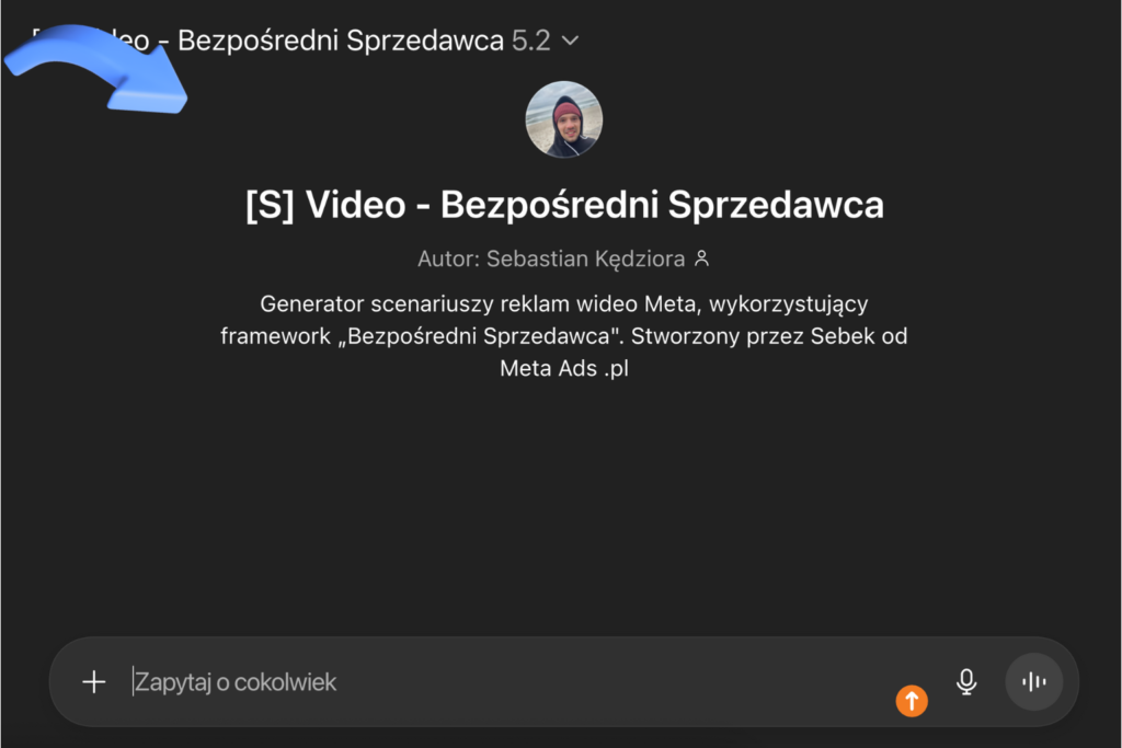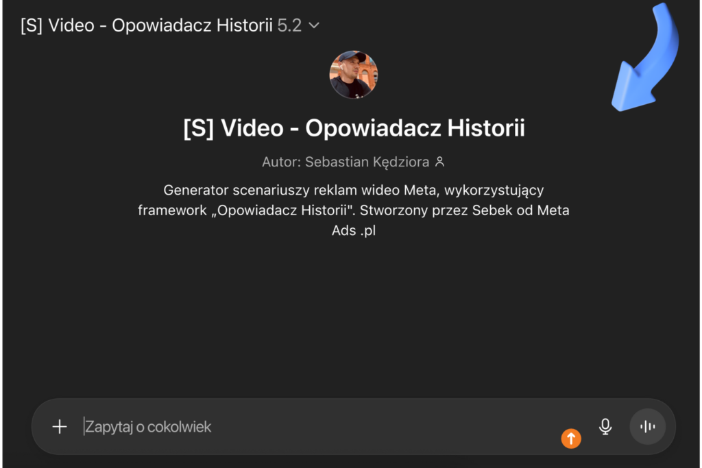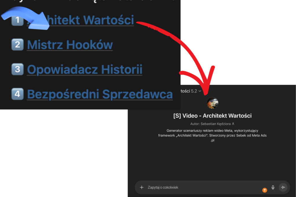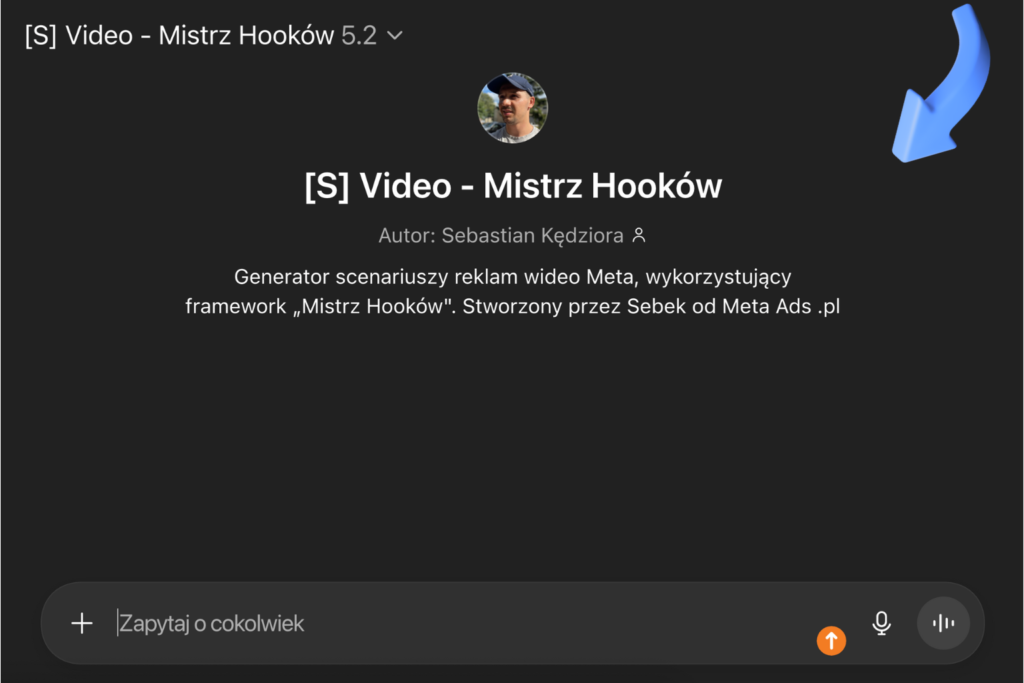 Cztery wyspecjalizowane GPTs. Każdy z nich ma wbudowany moduł generowania potężnych hooków, ale każdy specjalizuje się w innym stylu kreacji reklamowej. Od krótkich, dynamicznych form, przez storytellingowe, aż po bezpośrednią sprzedaż.