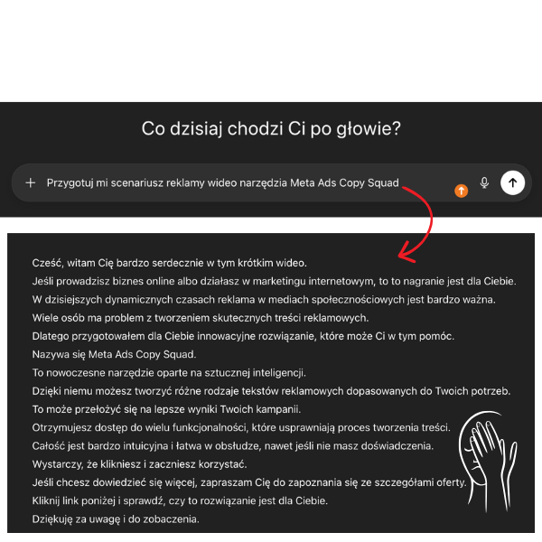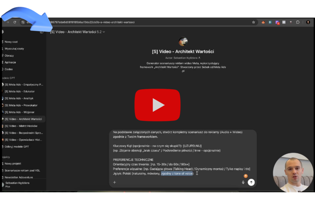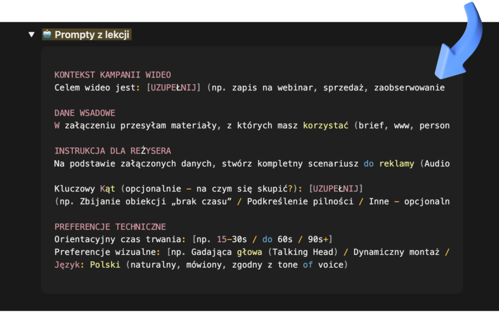 Aby GPTs jeszcze lepiej rozumiał cel reklamy wideo, do kogo jest kierowana i jakiego efektu oczekujesz, przygotowałem dla Ciebie gotowy prompt do uzupełnienia.