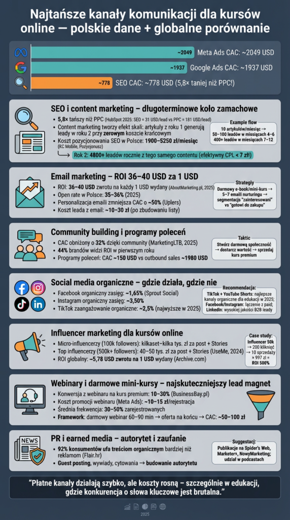 | Kanał | Średni CPC (PLN) | Średni CPM (PLN) | CAC dla kursu online (szacunek) | Źródło |